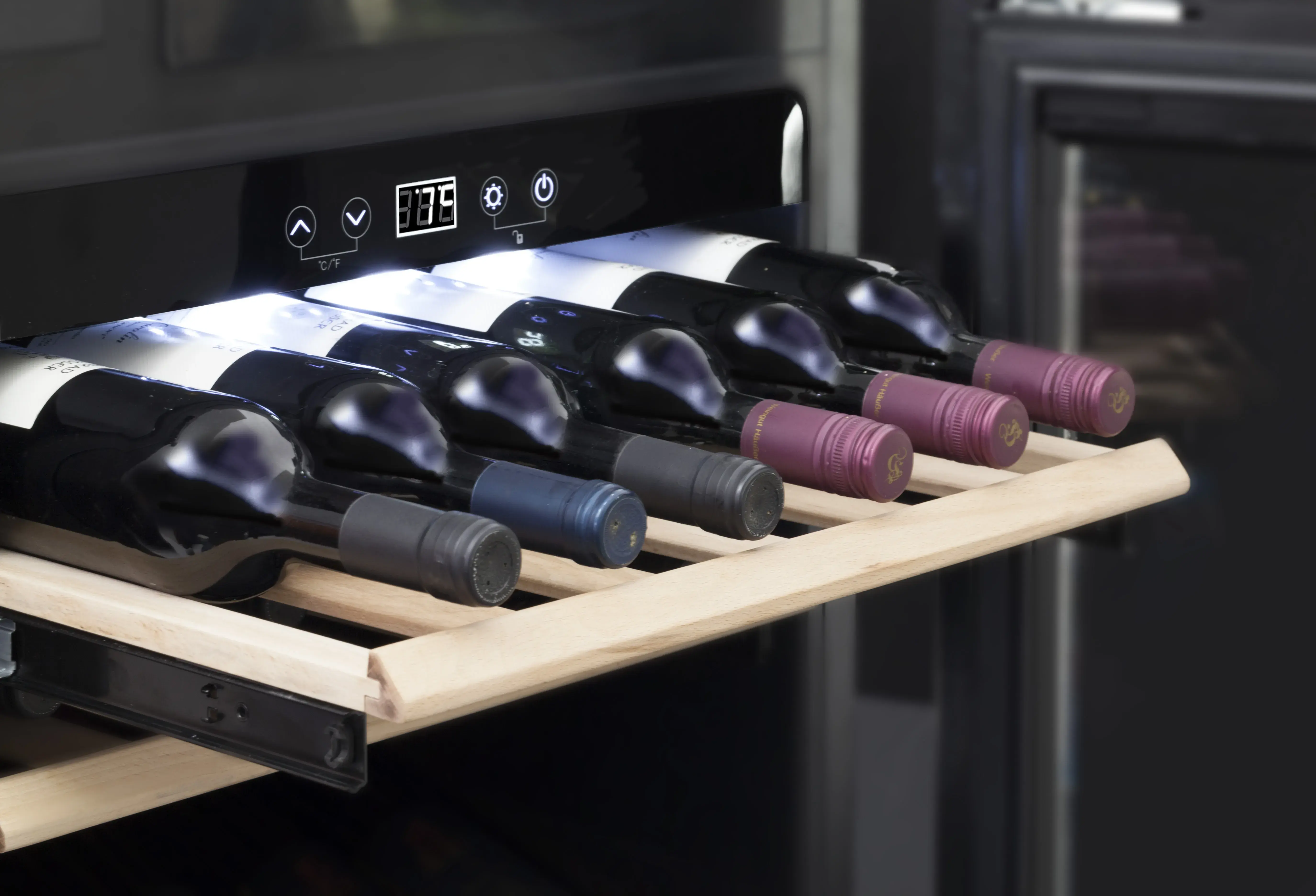 Die grifflose, elegante Push-to-open Türsteuerung mit hochwertigen Hettich Soft-Close-Scharnieren ermöglichen eine einfache und komfortable Bedienung der WineDeluxe-Weinkühlschränke. Die Temperatur der Kühlzonen wird per LED angezeigt, bei geöffneter Tür warnt ein Alarm bei Temperaturverlust. Dank der Holzlagerböden mit integrierten Teleskopschienen können die Weinflaschen einfach entnommen werden.